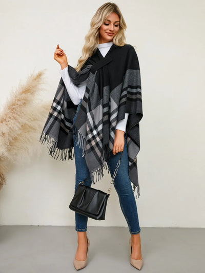 Fringe Contrast Plaid Poncho